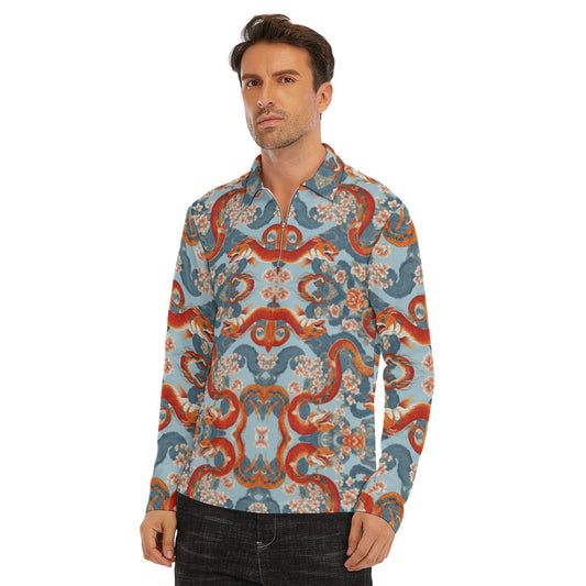 PGP Holiday Men's Lapel T-shirt with Neckline Zipper Closure | Blossom Serpent Orange & Blue | Prosp