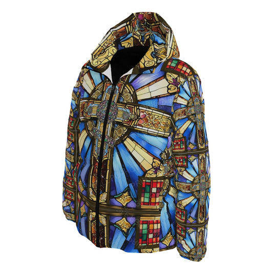 Orthodox Three-Wood Cross Stained Glass Hooded Unisex Down Jacket – Windproof, Warm & Stylish