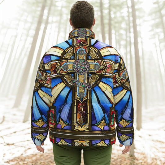 Orthodox Three-Wood Cross Stained Glass Stand-Up Collar Down Jacket – Windproof, Lightweight & Warm