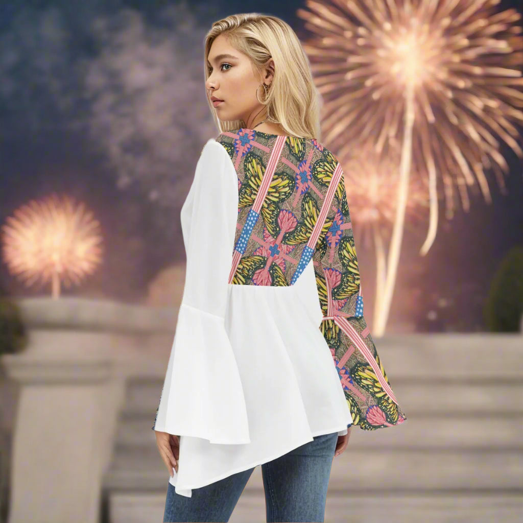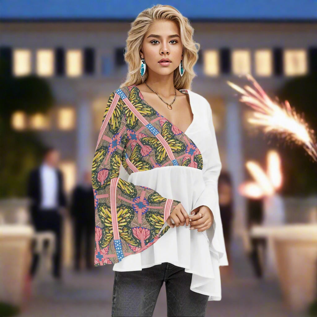 Step into effortless elegance with the Melissa Unbound Flared Sleeve Peplum Blouse from PGP Holiday. Made from lightweight 100% polyester, this blouse features a deep V folded collar and flowing butterfly-style flared sleeves that add a touch of drama to your everyday wardrobe. The flattering peplum silhouette enhances the waistline while offering a comfortable regular fit, perfect for pairing with jeans, skirts, or trousers. Whether you're dressing up for a summer outing or keeping it casually chic, this blouse brings stylish flair to any look with ease.