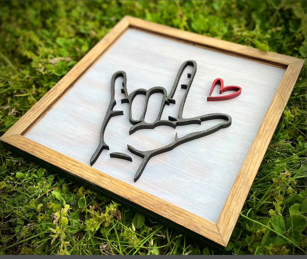 Crafted from a thoughtful blend of wood and acrylic, this framed piece features the iconic ASL “I Love You” hand sign, accented with a subtle heart detail for added warmth and meaning. The layered design creates gentle depth and shadow, giving the artwork a modern yet timeless presence that feels both personal and intentional.