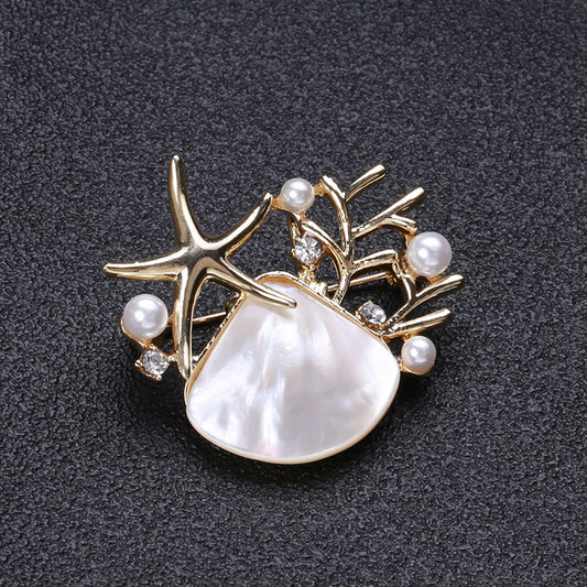 Abalone Shell Scallop Starfish Brooch – Elegant Ocean-Inspired Pin with Pearl Detail | 39x36mm