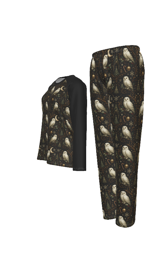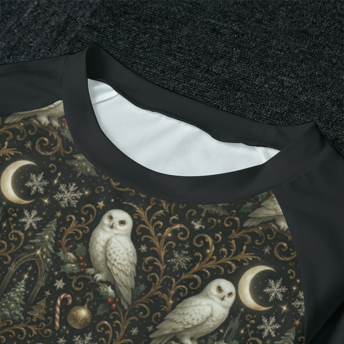 These women’s raglan pajamas feature the enchanting artwork that won your community vote — snowy owls, golden filigree, moonlit trees, and winter magic woven into every detail. Crafted for softness, warmth, and ease of movement, these pajamas bring the cozy elegance of Yule Court straight into your home.
