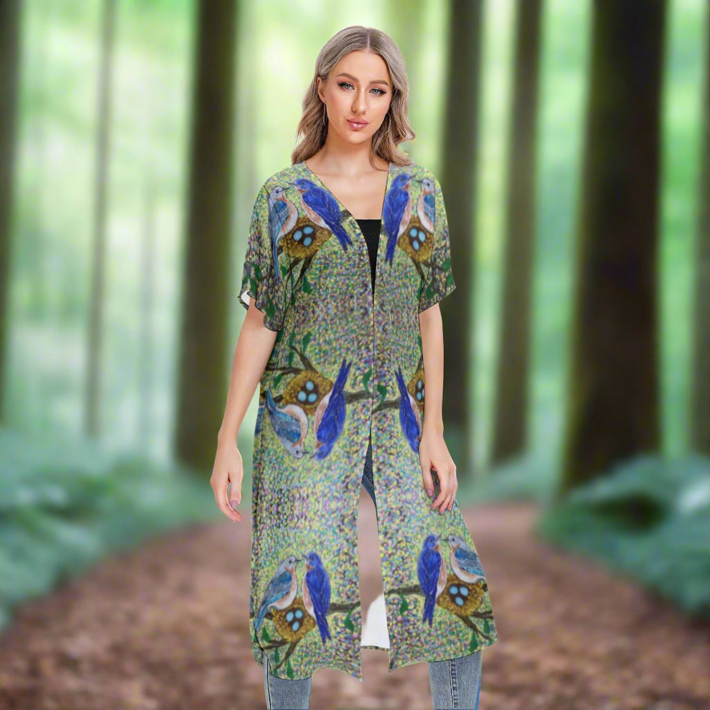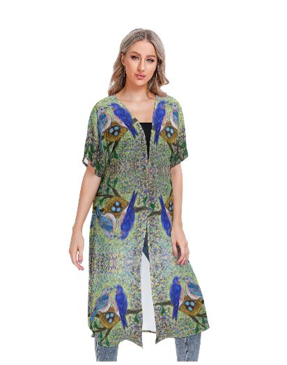 "I follow the call of Nature and find my inspiration from birdsong and peaceful breezes filled with floral scents. Springtime is a lovely time for renewed energy and hope. Sunshine warms our hearts and brings new life all around. Seeds of riotous color and fragrance have awakened. Bright flashes of colorful birds on wing fill the air with joy. My heart takes flight with new creative expression because Art Is My Nature. The title of this work is "BLUEBIRDS". Springtime is the time for all things new and joyful. Easter fills the season with happiness, renewed hope, and fresh growth. Let the sun rise on new beginnings and rejoice as this beautiful season fills the air with floral scents and lovely birdsong. Bluebirds represent happiness! Give your personal style bluebird wings and share your joy with the world!" - MRD