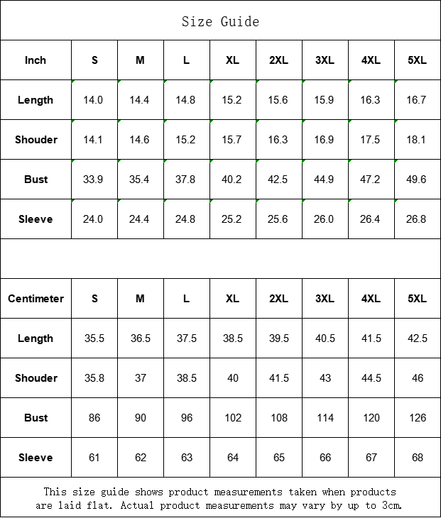 Centimeter | S | M | L | XL | 2XL | 3XL | 4XL | 5XL |