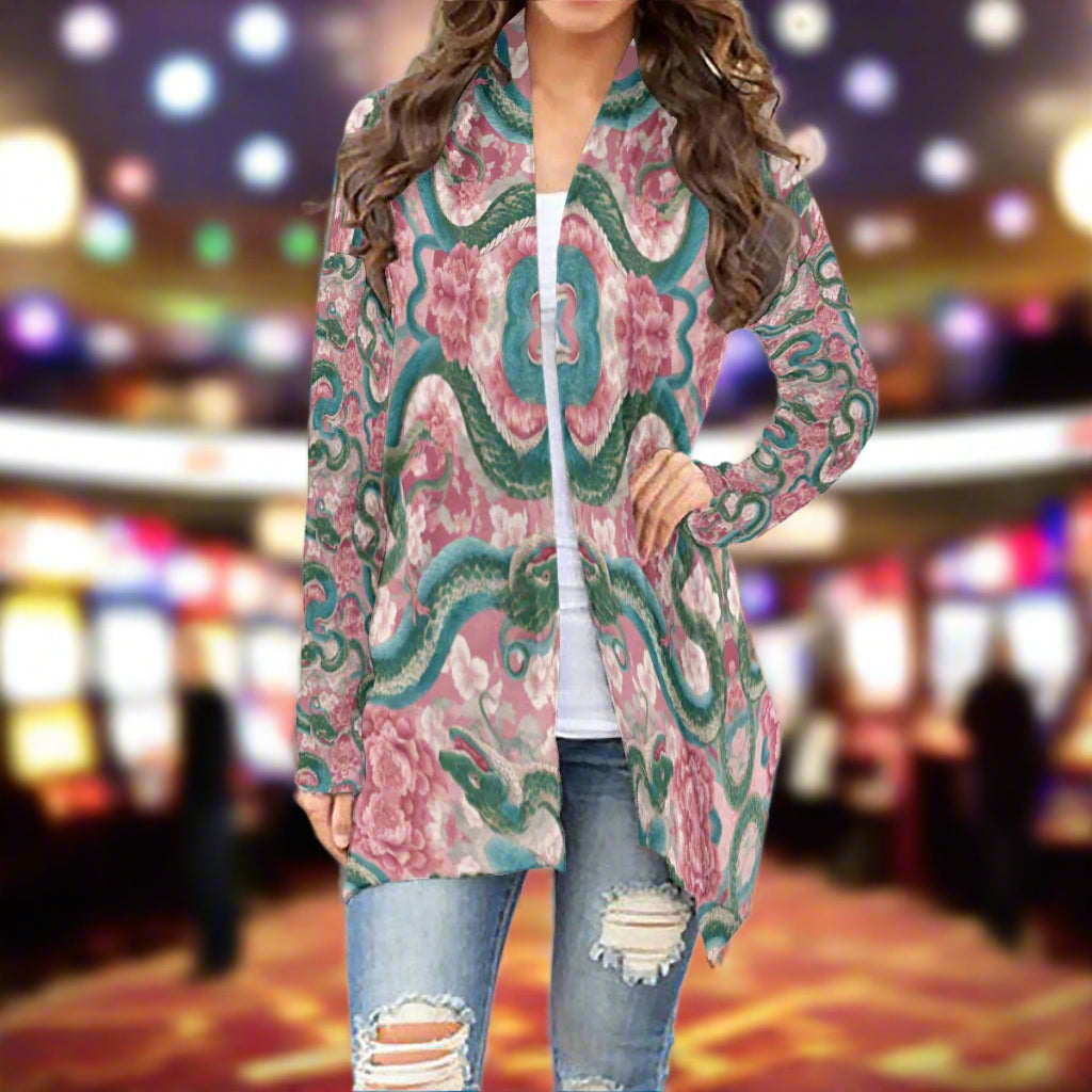 This elegant mid-length cardigan features a unique irregular placket and shawl collar for a modern, sophisticated look. Crafted from soft jersey fabric (95% polyester, 5% spandex), it offers a flattering fit and effortless comfort. Perfect for layering, this versatile piece blends timeless style with contemporary charm.
