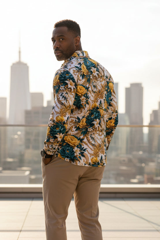 Bold, polished, and richly styled, the Intuition Baroque Botanical Long Sleeve Men’s Polo brings a more dramatic expression into WANDERSPRING. Designed with an ornate floral-and-scroll print in deep teal, warm gold, and crisp ivory, this piece blends botanical romance with a more tailored, statement-making men’s perspective.