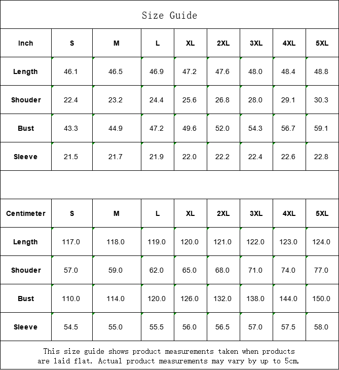 Centimeter | S | M | L | XL | 2XL | 3XL | 4XL | 5XL |