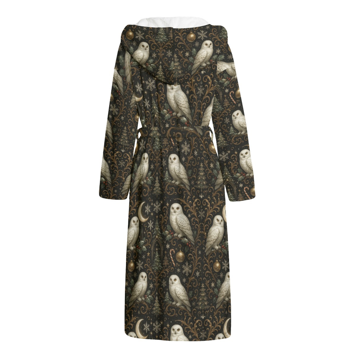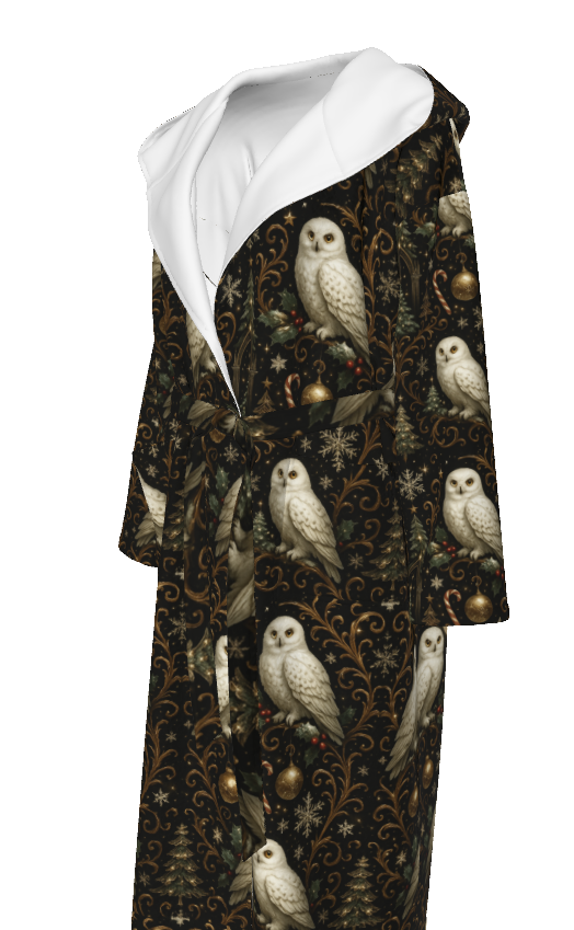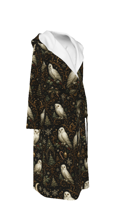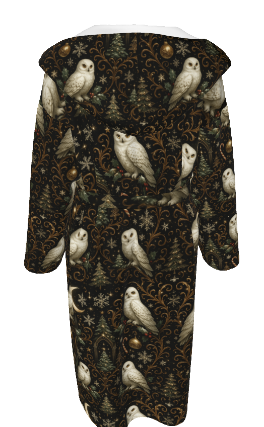 Step into the enchanted world of Yule Court — the design that your community voted #1 and the artwork that inspired Song #3 of the PGP Holiday Christmas Album Giveaway. This robe brings the song’s winter folklore and mystical storytelling to life through its detailed print of snowy owls, moonlit evergreens, gold filigree, and starlit skies.