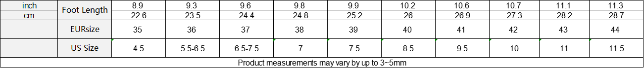 | EUR Size | US Size | Insole Length(inch) | Insole Length(mm) |