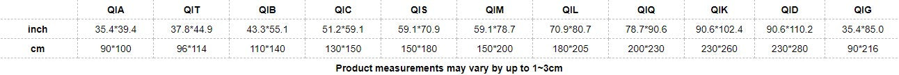 cm | 90*100 | 96*114 | 110*140 | 130*150 | 150*180 | 150*200 | 180*205 | 200*230 | 230*260 | 230*280 | 90*216 |
