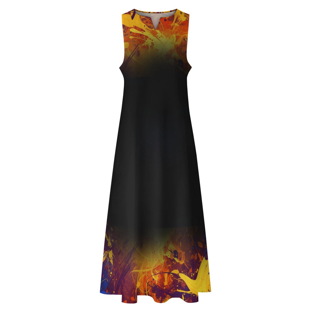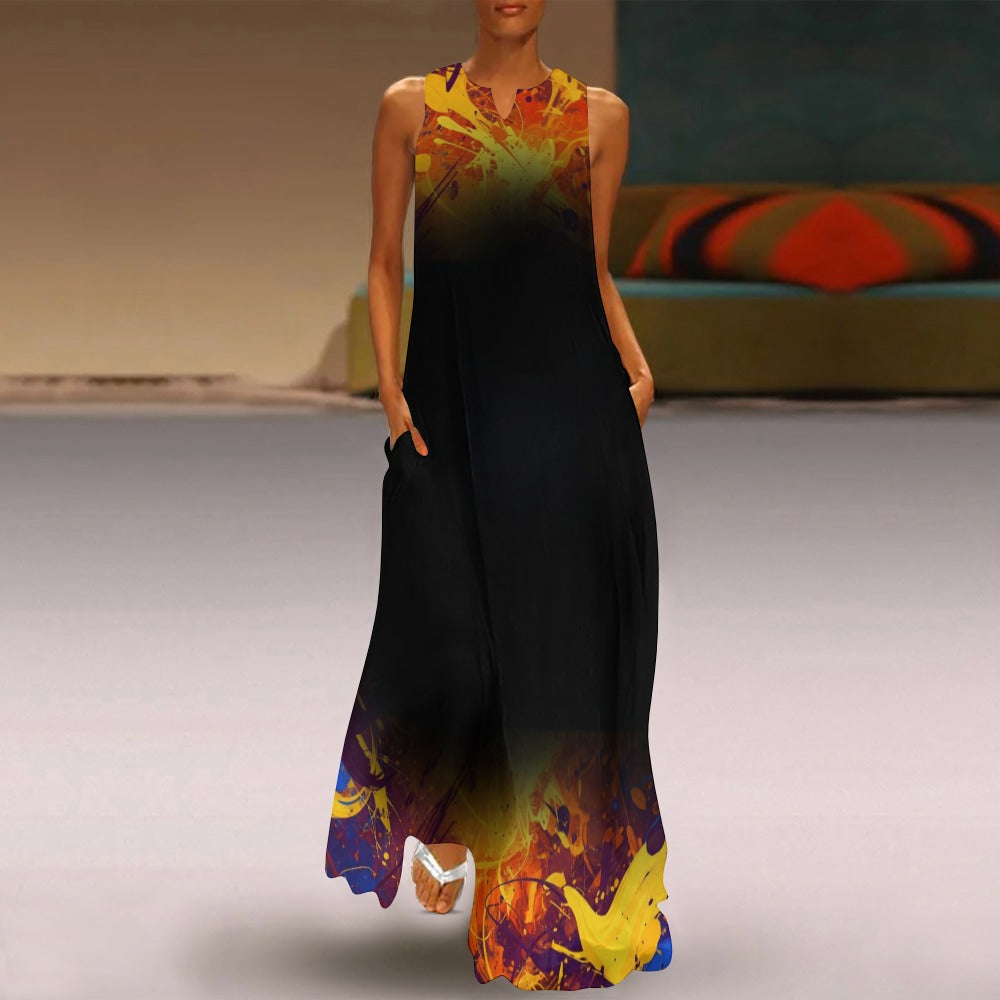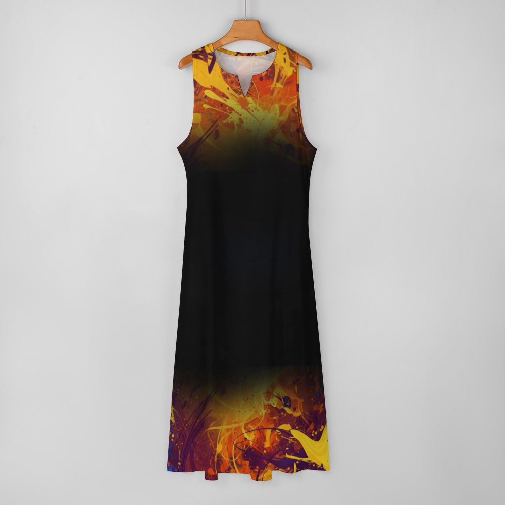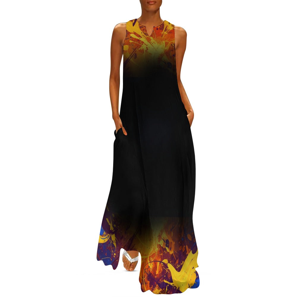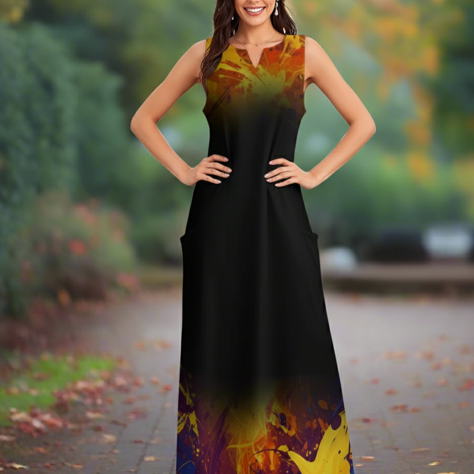 Elevate your autumn style with the Mystic Sleeveless Maxi Dress, where effortless elegance meets bold artistic flair. Crafted from 100% polyester, this flowing floor-length dress is soft, breathable, and comfortable, keeping you cool and confident through every occasion. The slim fit design flatters your waistline while visually elongating your silhouette, making it both graceful and versatile.