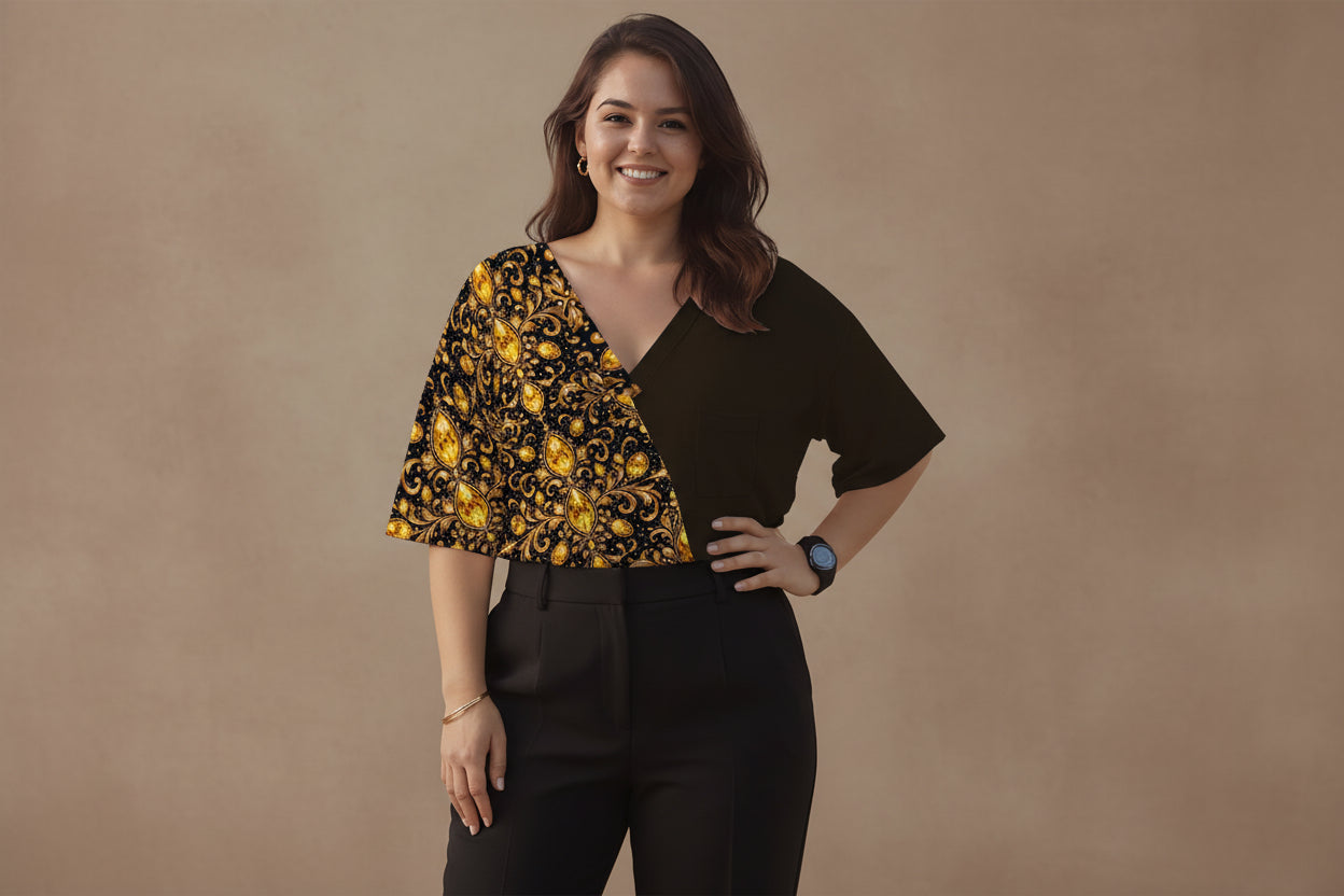 Finished in the Confidence palette of topaz and brass, this top reflects the collection’s philosophy: showing up as you are, without adjustment or apology.