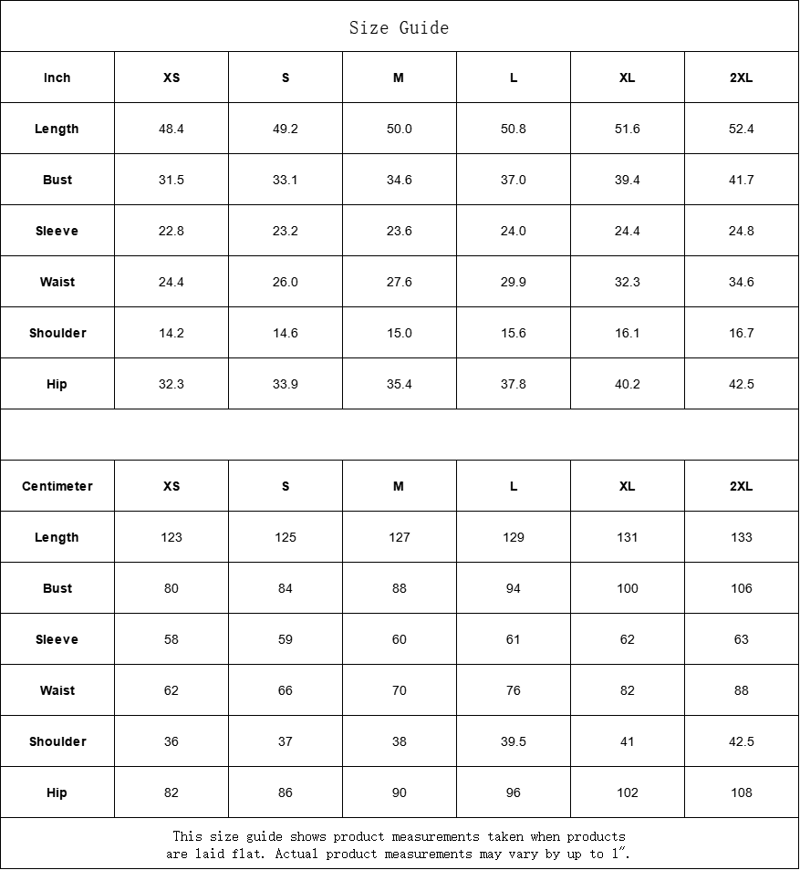 | Sleeve | 22.8 | 23.2 | 23.6 | 24.0 | 24.4 | 24.8 |