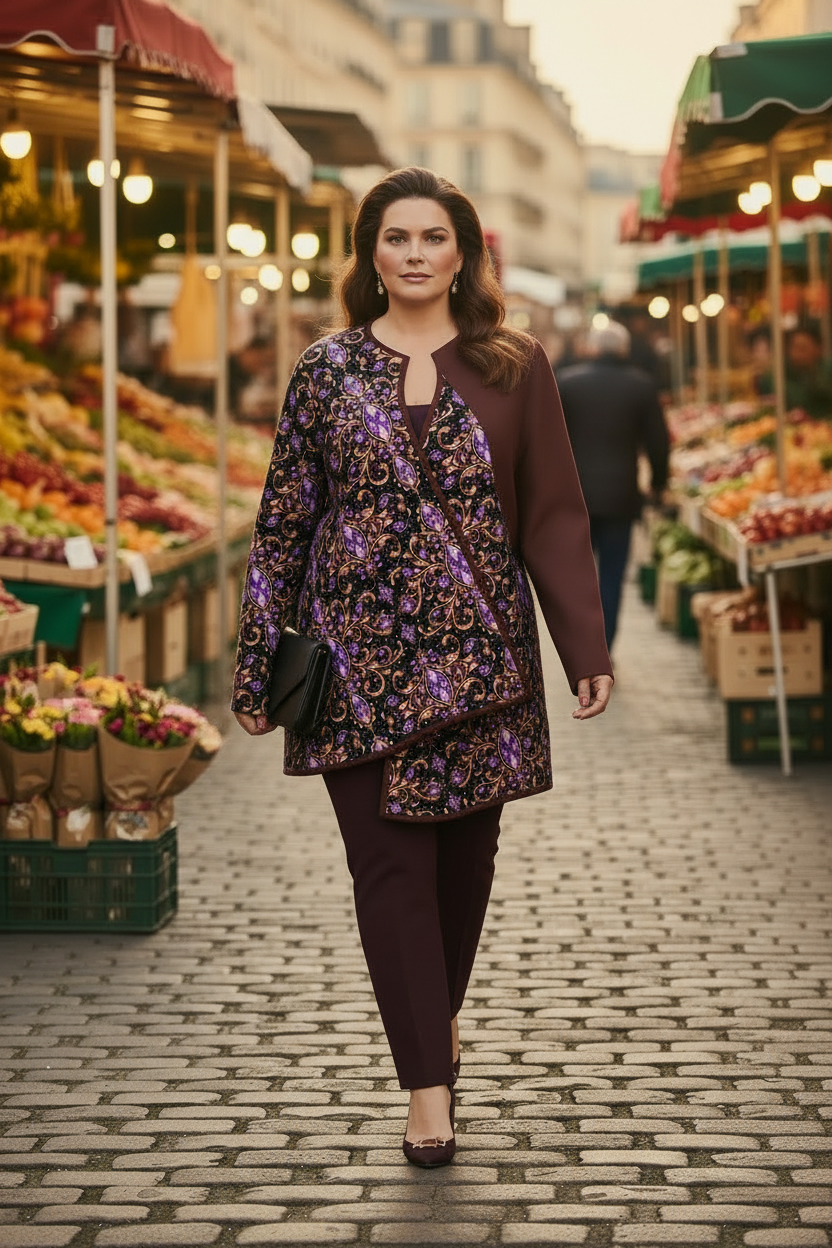 Crafted from smooth, sculptural scuba fabric with gentle stretch, this wrap layer holds its shape while remaining comfortable and forgiving. The asymmetrical silhouette and irregular hem create natural movement, while refined binding details add depth and quiet definition. A clean V-neckline frames the collarbone with softness, allowing the garment to feel open rather than restrictive.
