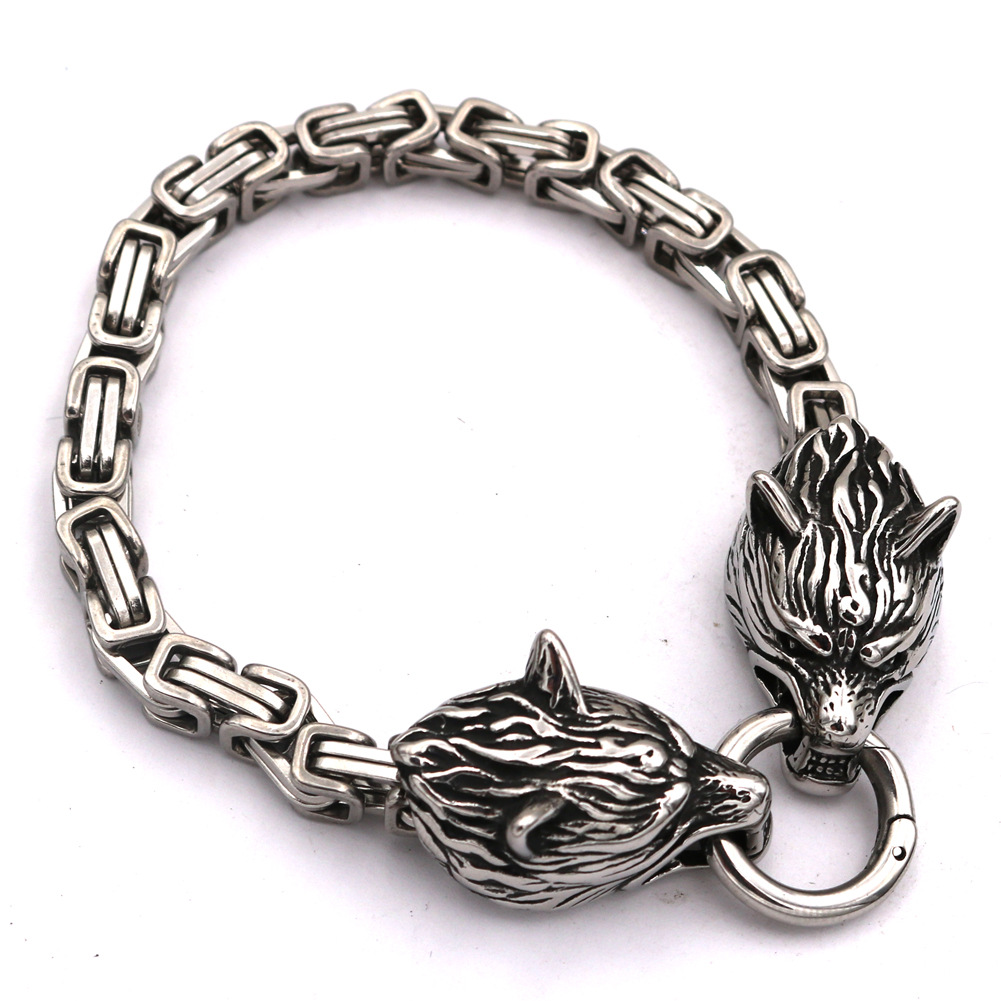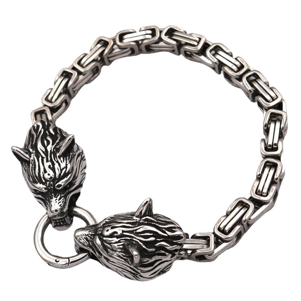 Crafted from high-quality titanium steel, it offers exceptional durability with a solid, premium weight feel. The interlocking chain links add texture and presence, while the sculpted wolf heads bring an unmistakable edge inspired by European and American styling. Finished in timeless metallic tones, this bracelet transitions seamlessly from everyday wear to statement styling.