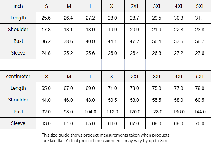 Centimeter | S | M | L | XL | 2XL | 3XL | 4XL | 5XL |