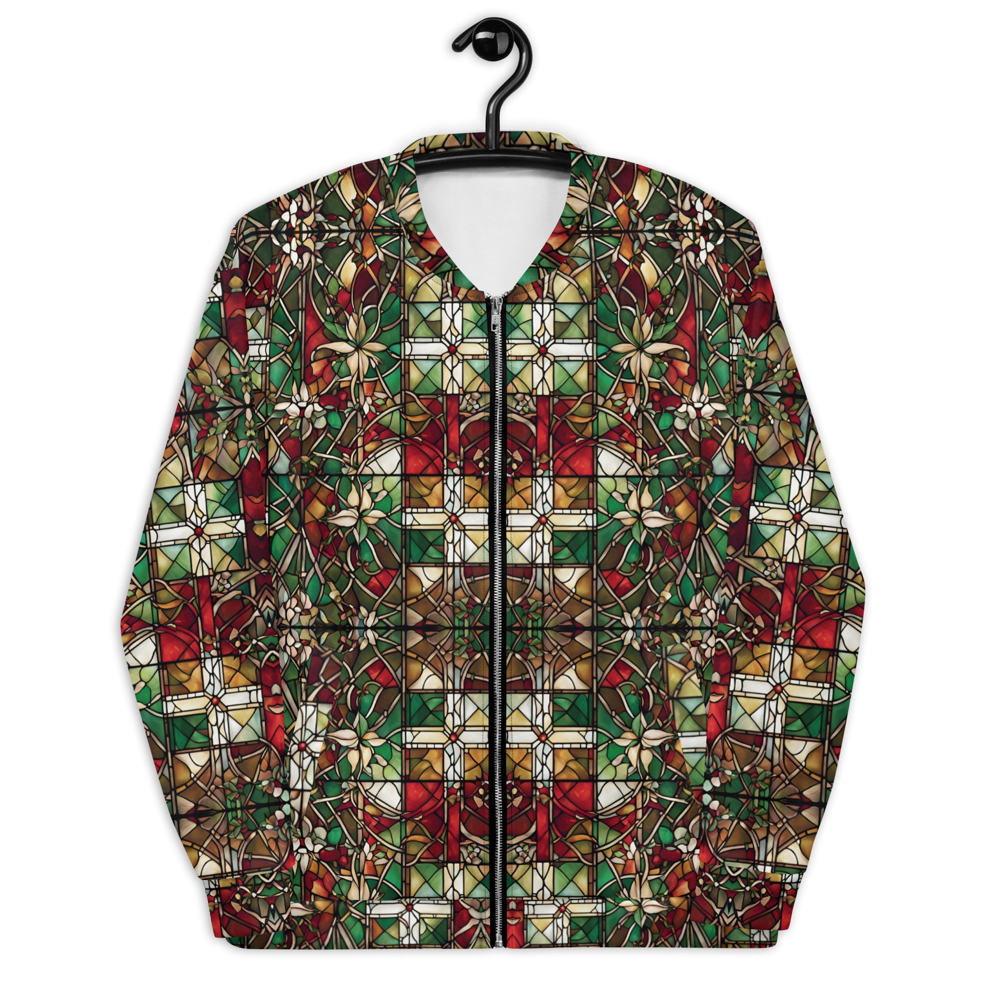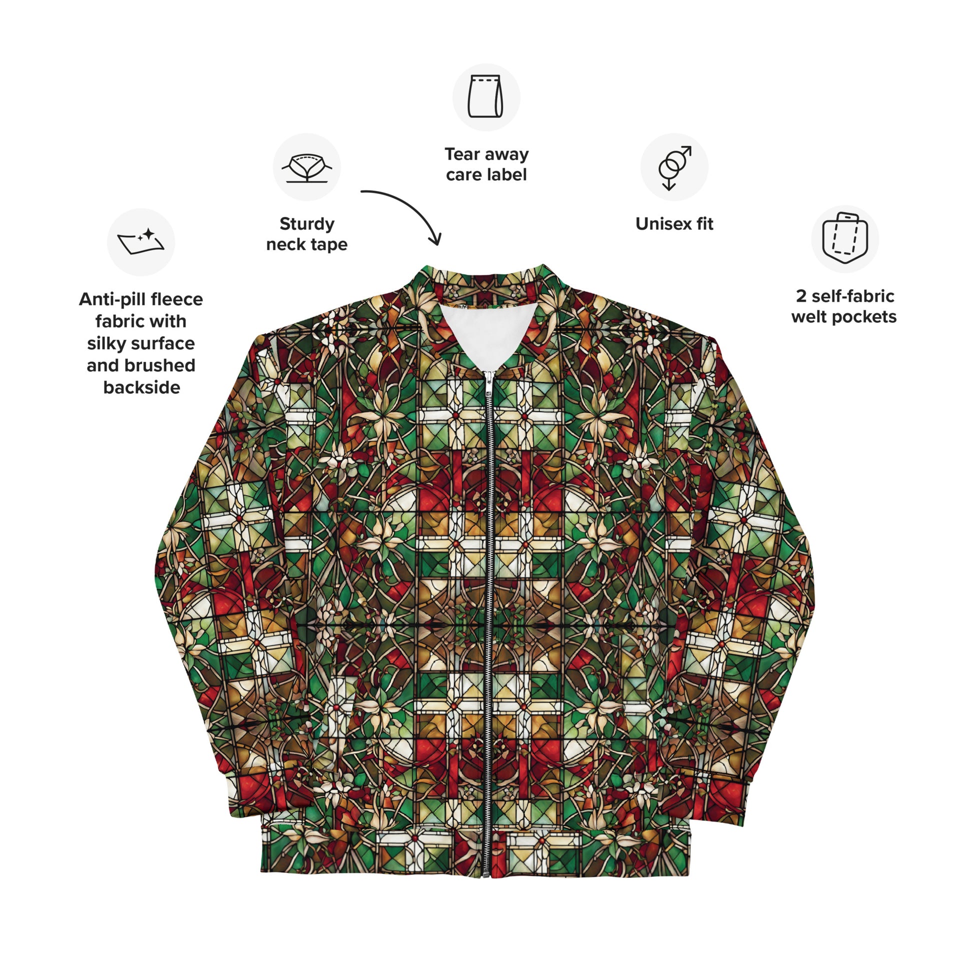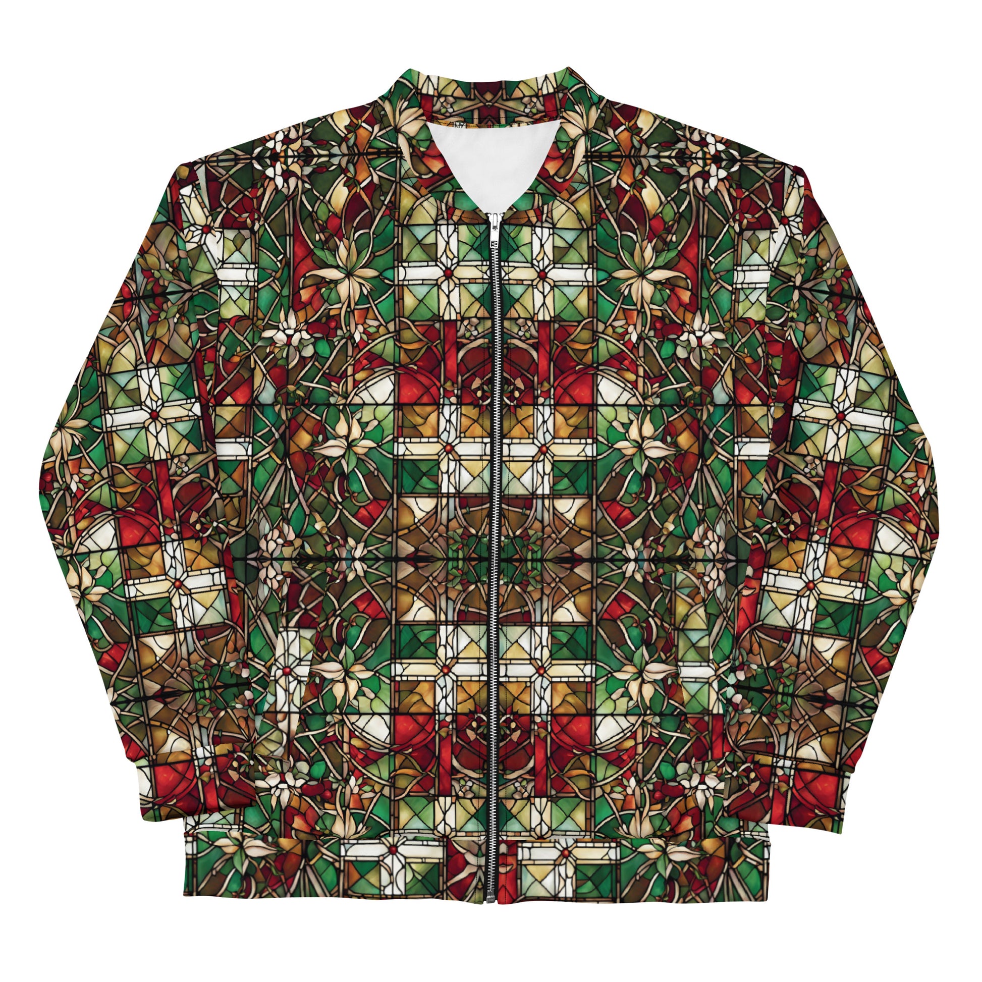 Add zing to your holiday wardrobe with this vibrant Red & Green Highlands Bomber Jacket. Featuring an all-over print inspired by tartan and stained glass, it pairs effortlessly with a t-shirt or hoodie. With brushed fleece inside and a relaxed unisex fit, this jacket is as cozy as it is stylish—grab yours before it’s gone!
