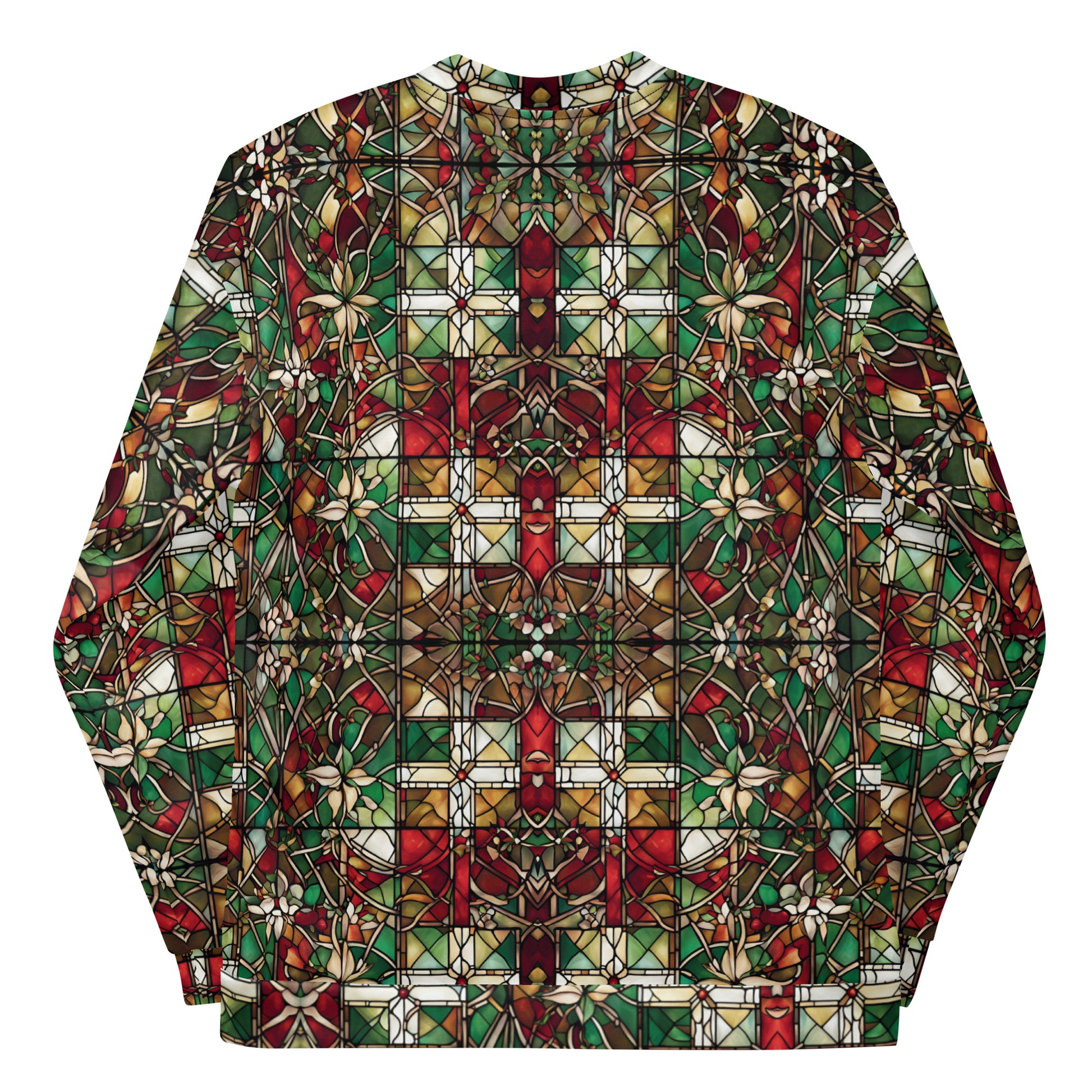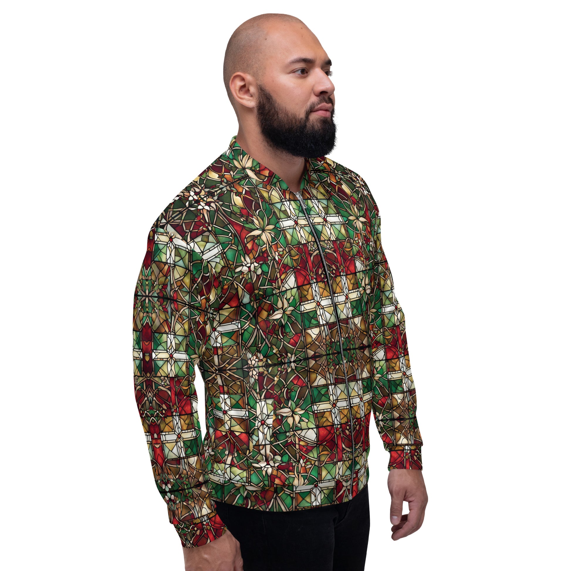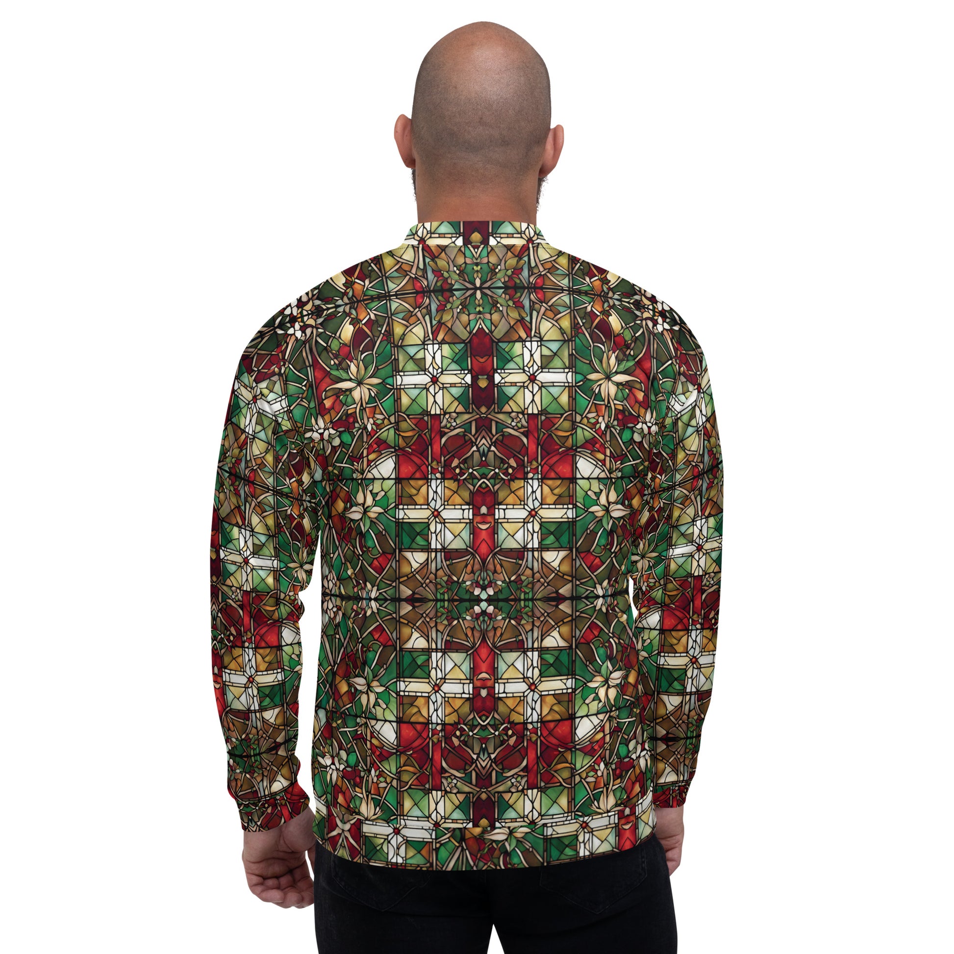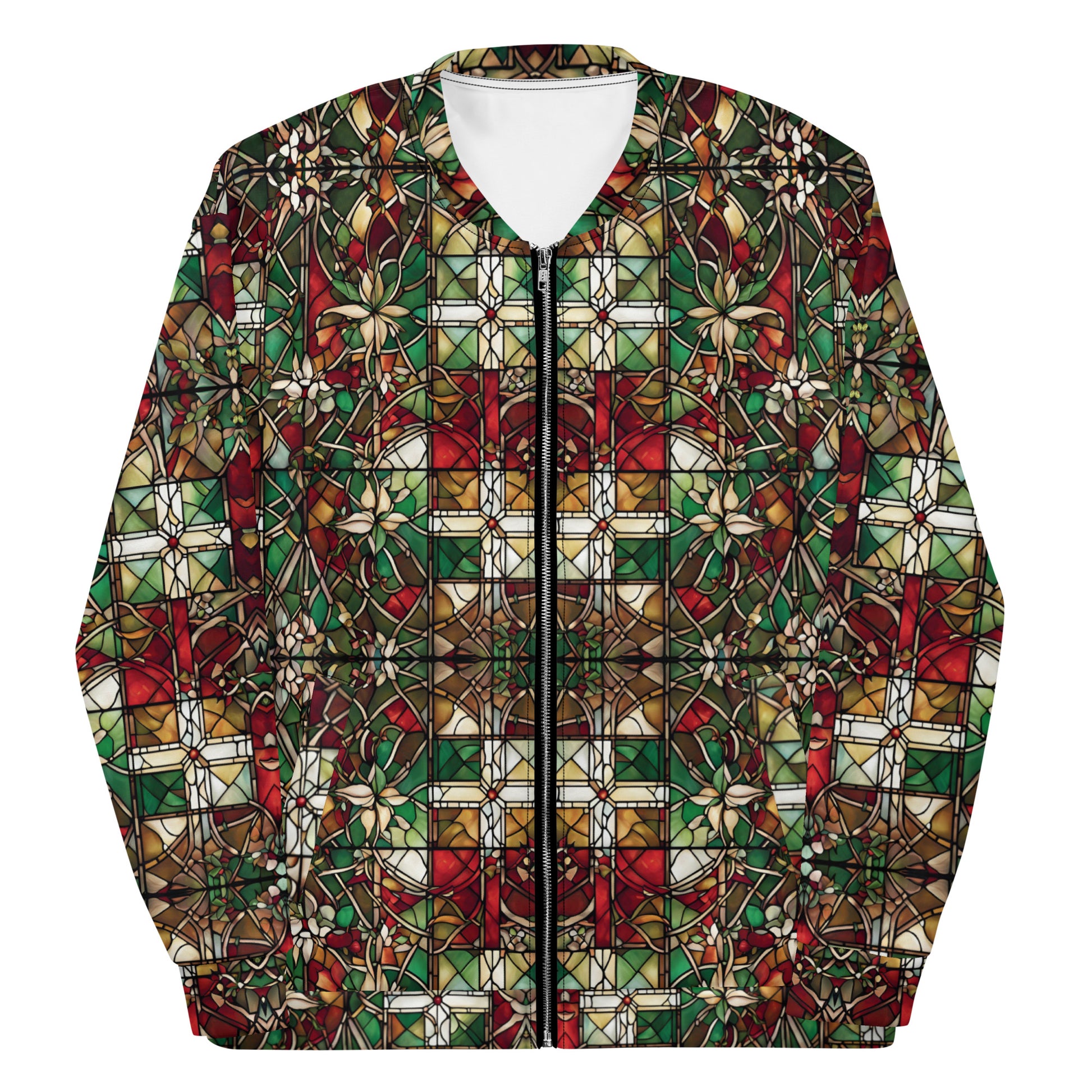 Add zing to your holiday wardrobe with this vibrant Red & Green Highlands Bomber Jacket. Featuring an all-over print inspired by tartan and stained glass, it pairs effortlessly with a t-shirt or hoodie. With brushed fleece inside and a relaxed unisex fit, this jacket is as cozy as it is stylish—grab yours before it’s gone!