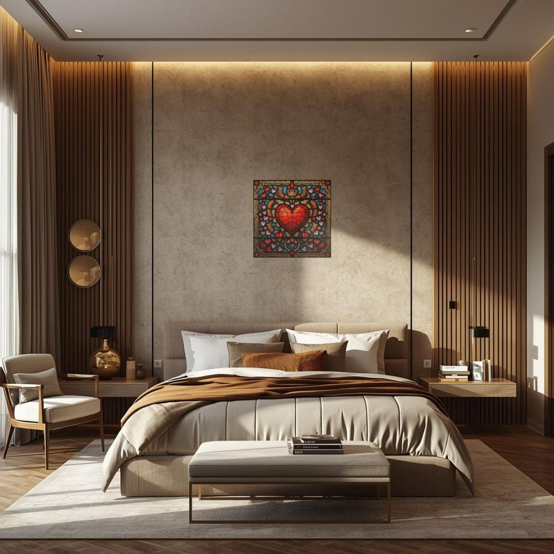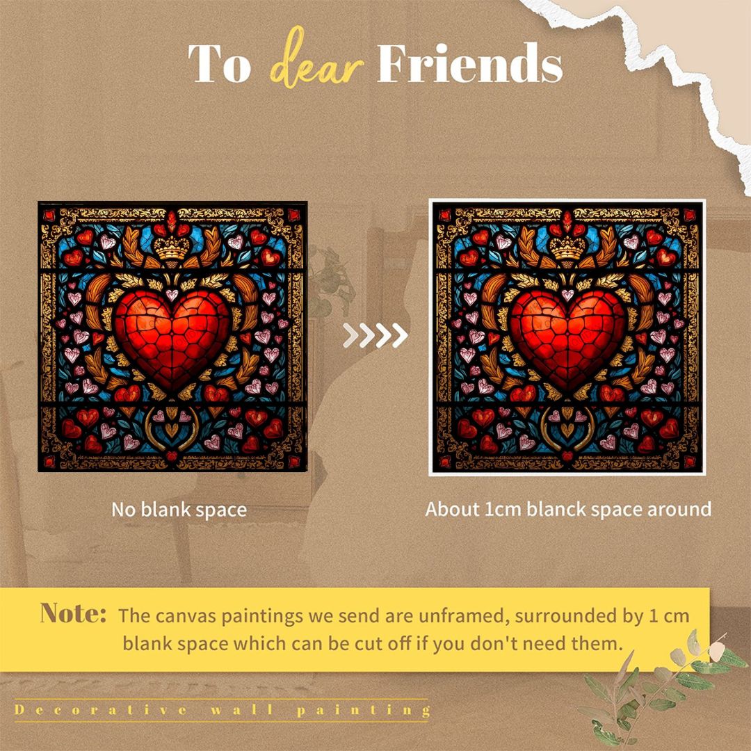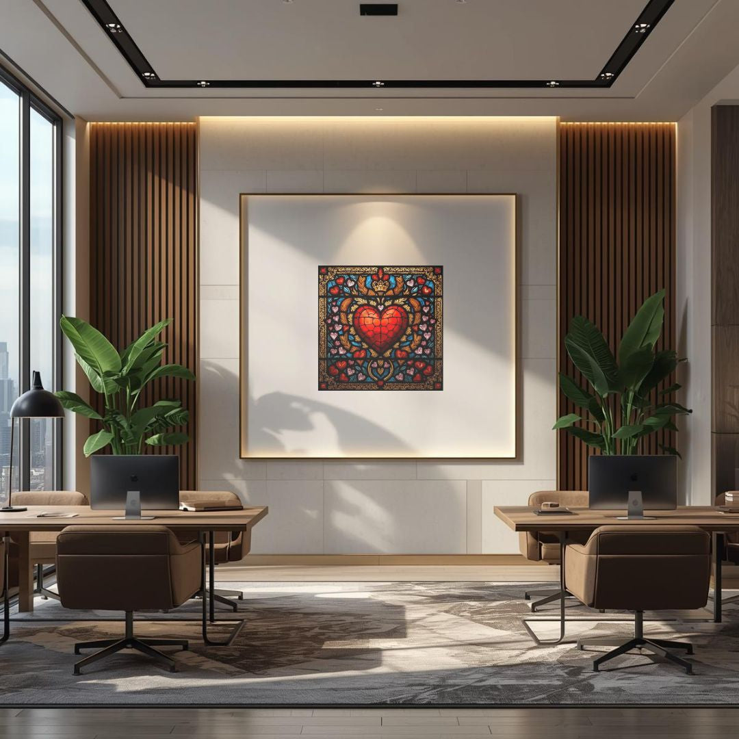 Glassworks III centers the idea of self-devotion through light, symmetry, and restraint. The gallery quality canvas print composition draws from stained-glass traditions—layered reds, softened golds, and deep framing tones—forming a heart that feels contemplative rather than ornamental. It holds visual weight without excess, offering a quiet sense of intention that settles naturally into a room.