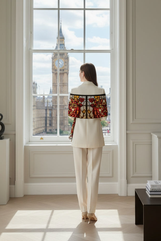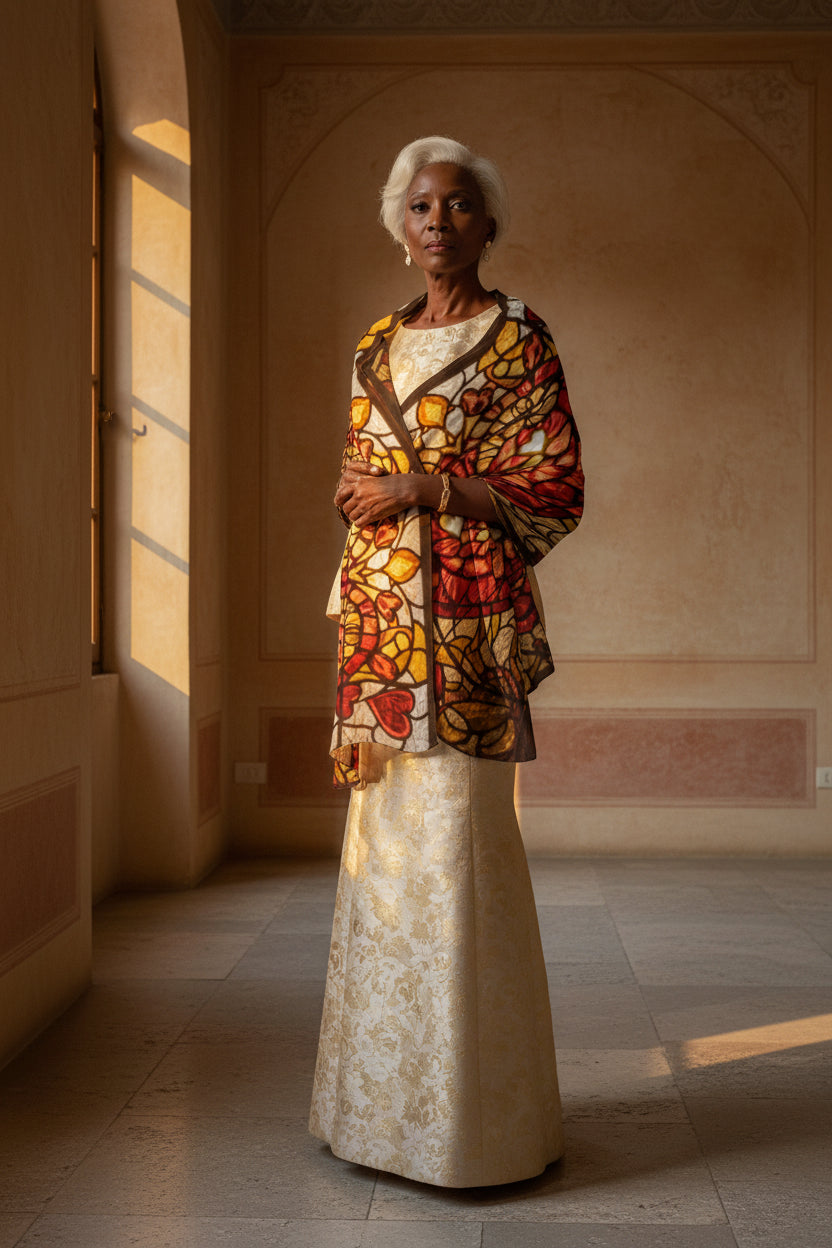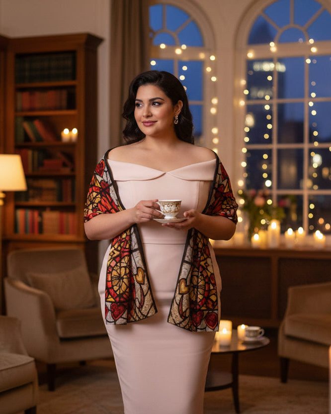 Inspired by stained glass, the composition reveals itself gradually. A heart is suggested through structure and color rather than overt decoration, allowing meaning to emerge slowly with wear and movement. Each scarf is artisan-crafted per order from original artwork by Impressionist painter Patrick Gorman Pettis, making every piece an intentional extension of the Valenedit philosophy.