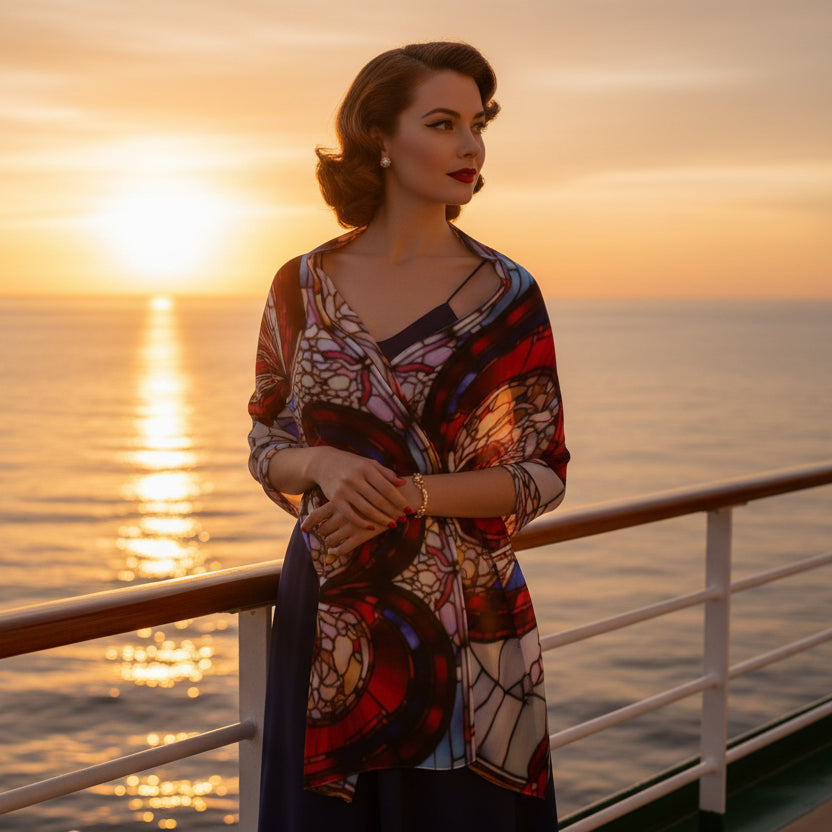 Glassworks V approaches elegance through balance rather than excess. The design draws from stained-glass influence—layered color, softened geometry, and controlled contrast—translated onto a fluid, silk-like surface that moves with quiet confidence. It reads as intentional and composed, adding depth to an outfit without overt statement.