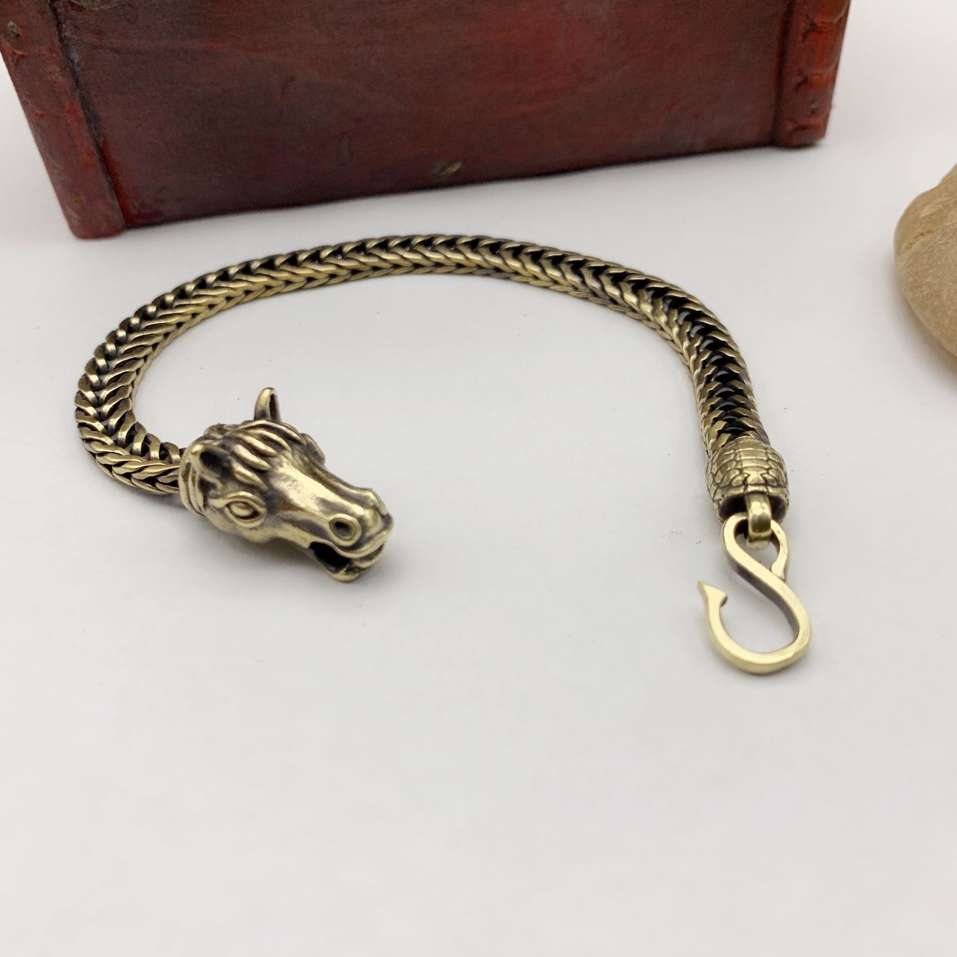 A solid brass chain bracelet finished with a sculpted horse-head clasp, this piece reads old-world and confident. The horse detail gives it that Celtic-style spirit: strength, loyalty, forward motion. It’s the kind of accessory that anchors everything—black tee, knit polo, wool coat—without trying too hard.